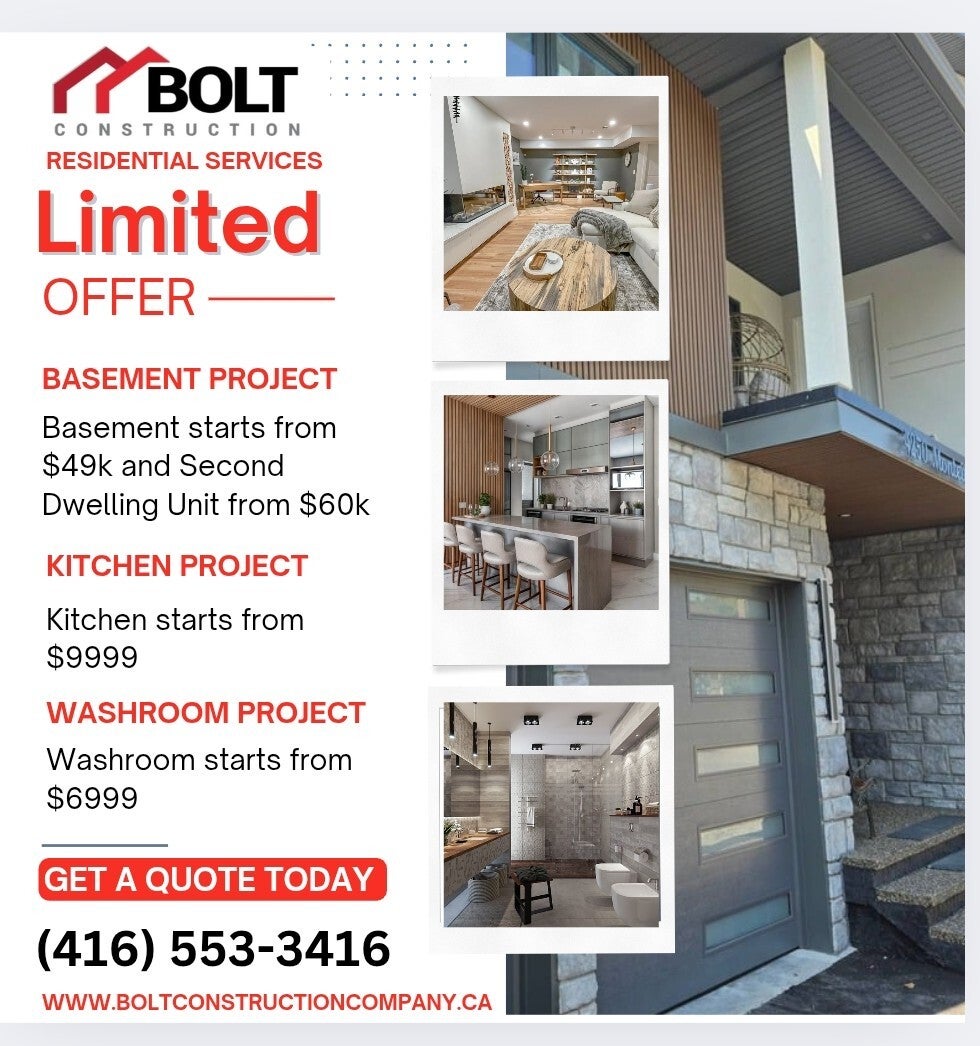 With 18+ years of experience, Bolt Construction specializes in transforming older G.T.A homes into modern, functional spaces. From your first consultation to permit approvals, 3D design, and construction, we handle every step. Our design-build process ensures your vision becomes reality – with no surprises.